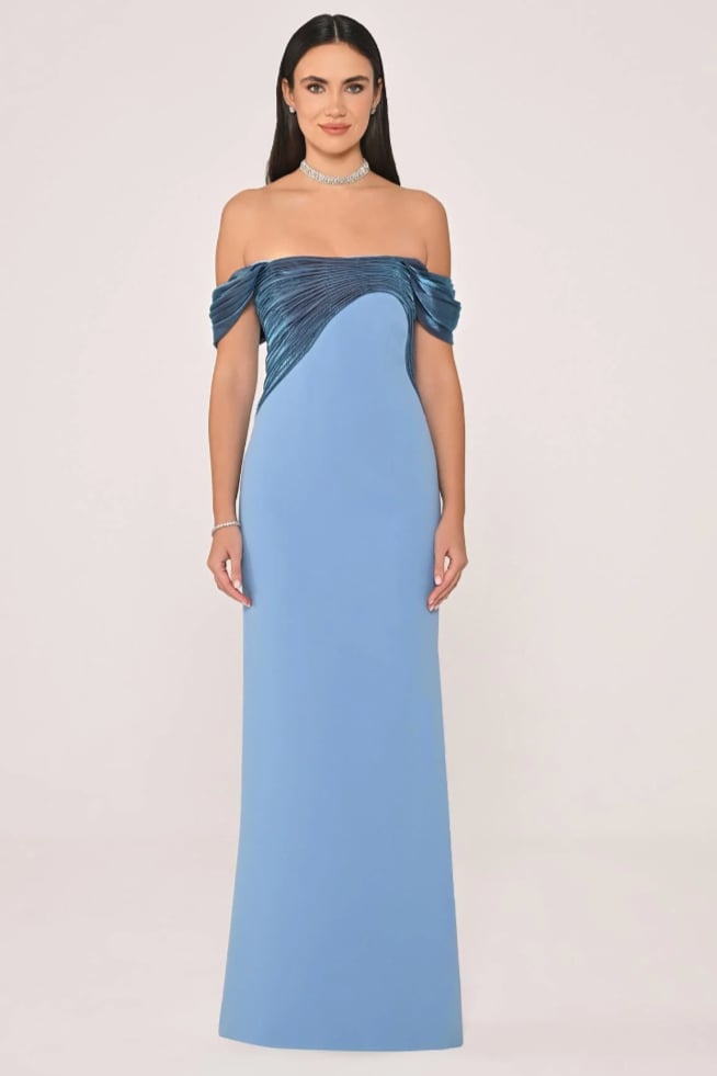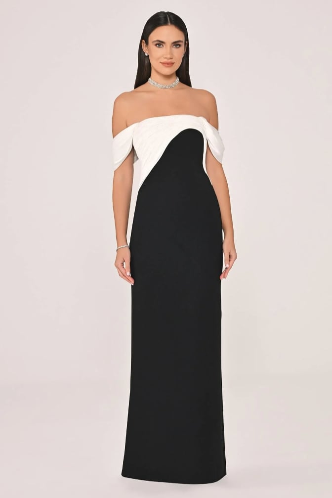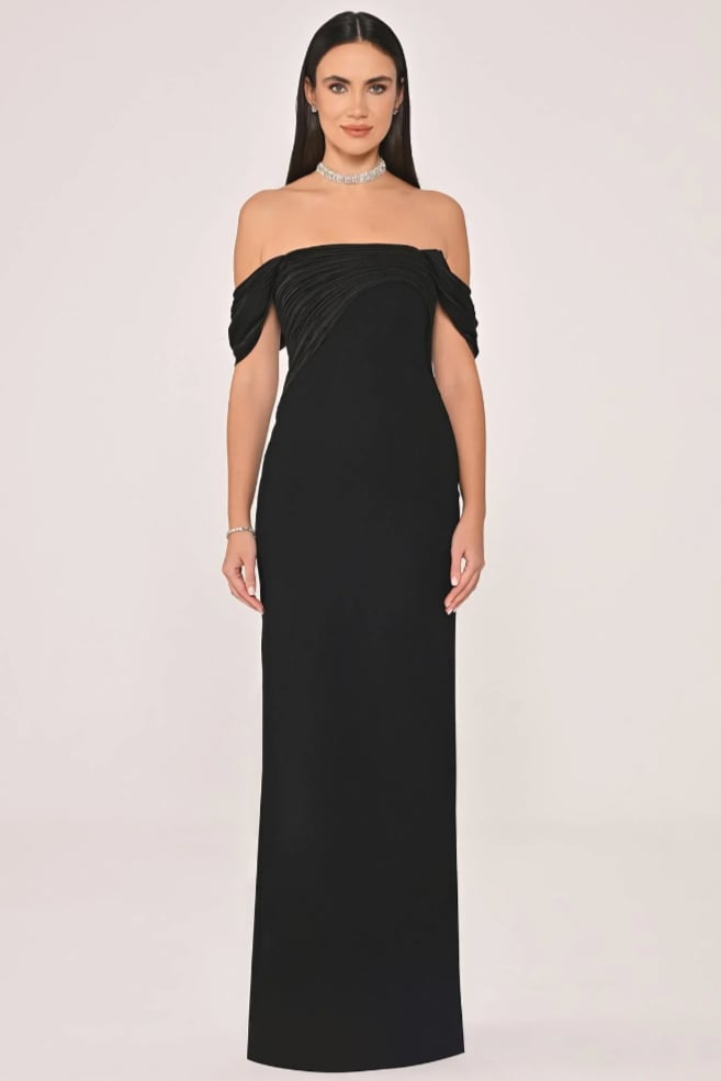 فستان طويل من الكريب مع ياقة ساتان وأكتاف مكشوفة